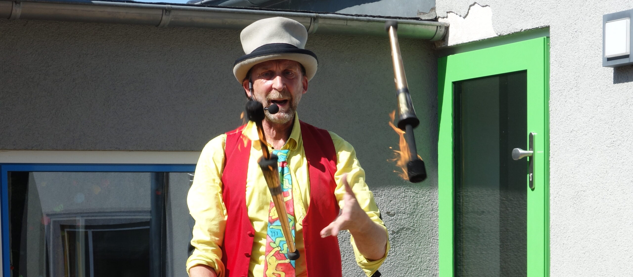Voller Spannung wurden wir von https://www.kleinkunst-micha.de/ in der Turnhalle empfangen. Es gab eine zauberhafte Show mit Jonglage, Diabolo und Feuer. Auch Kinder und Erzieher durften ihr „Talent“ unter Beweis stellen.